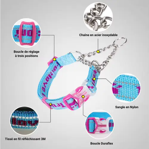 Pourquoi c’est important : Les chiens à tête fine peuvent facilement s’échapper d’un collier standard. La martingale empêche cette évasion tout en restant confortable et sécuritaire.