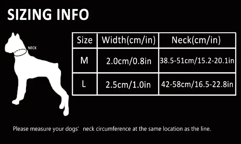 📏 Comment mesurer : Mesurez le tour du cou de votre chien avec un mètre souple. Vous devez pouvoir passer un doigt entre le collier et le cou.