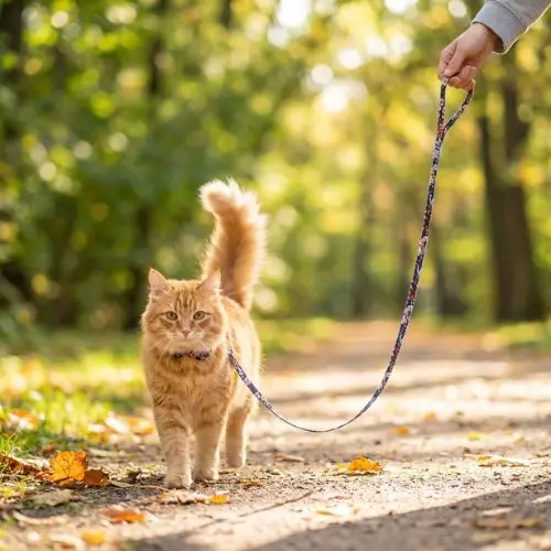 - L'apprentissage : Si c'est une première fois, commencez par de courtes séances à l'intérieur de la maison pour que votre félin s'habitue à la sensation de la laisse qui le suit.