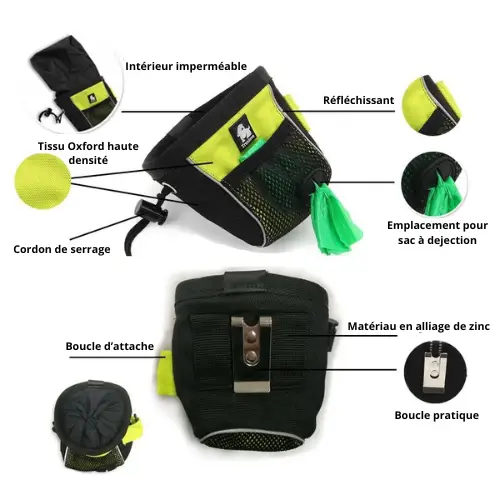 L’entraînement de votre chien devient plus fluide grâce à la possibilité de garder les friandises à portée de main, sans avoir à fouiller dans un sac ou une poche. Cette facilité d’accès aux récompenses vous permet d’être réactif et de récompenser instantanément votre chien, ce qui est un élément clé dans les méthodes de renforcement positif.